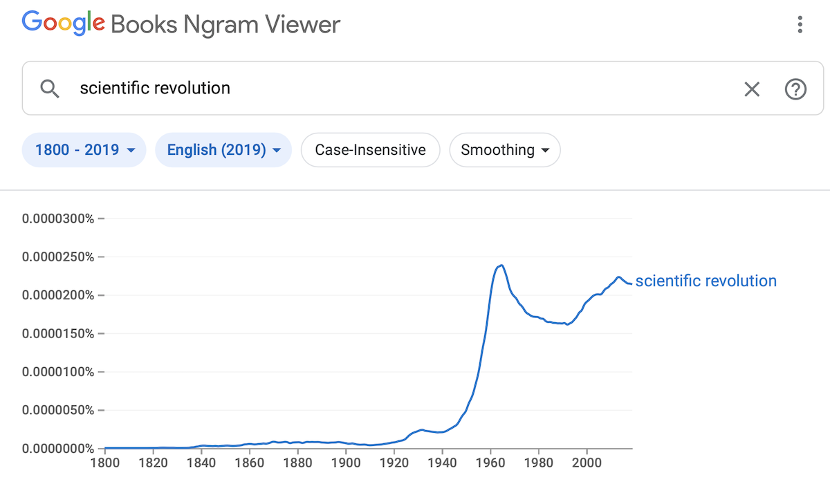 The focus on the idea of scientific revolutions is also a novelty of the mid 20th century. While the term appeared sporadically in the years prior, it enjoyed an explosive growth in the mid 20th century, as this ngram shows: