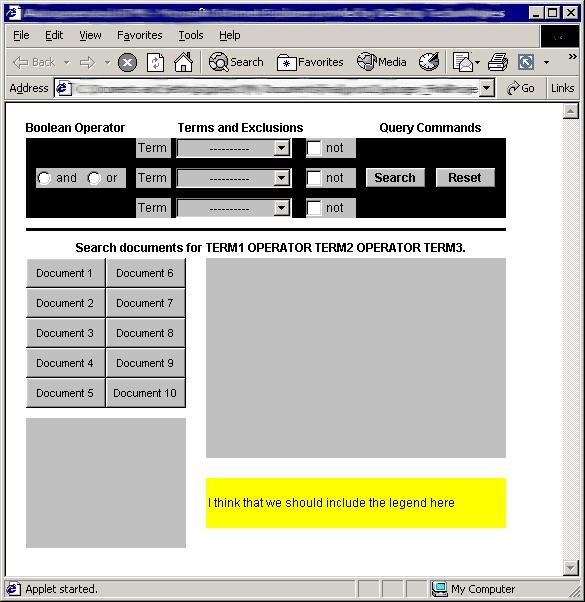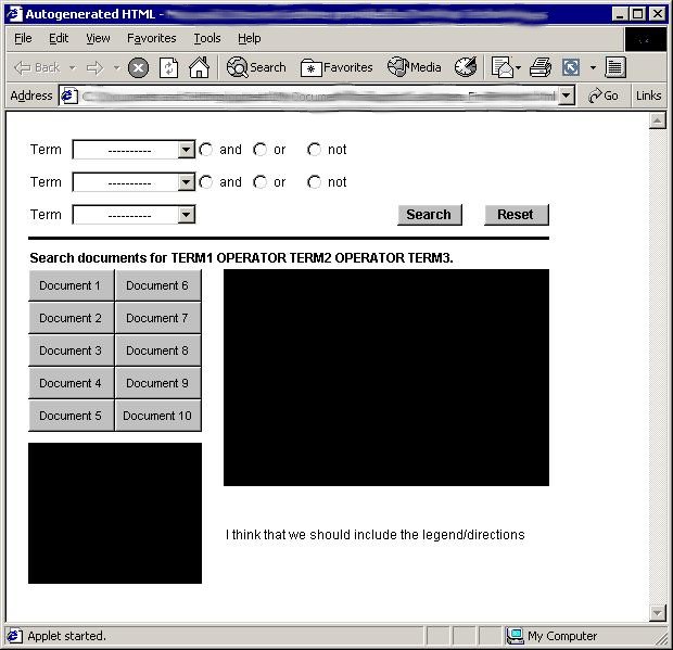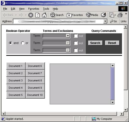 Over the course of the project we developed several prototype models. After reviewing the models in our group we presented the final two prototypes to our client. Once a final selection was chosen work proceeded to complete the application code for the applet.