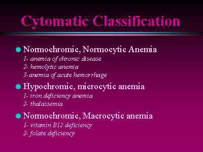 | The cytomatic classification of the red blood cells will give us very important information for the first step in diagnosing the type of anemia we are investigating. It will lead us to which direction do we need to carry our laboratory screening for the the exact causal diagnosis for anemia. |