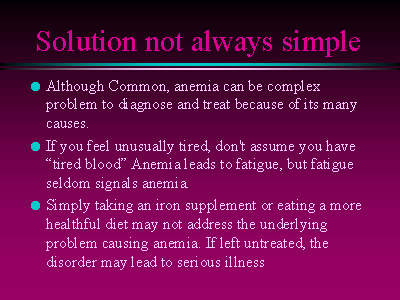 | The focus Therapy should be on the underlying disorder. The Anemia itself is rarely an important clinical problem except there is insufficient dietary supply of iron ,folic, acid and B12. Or incase of acute bleeding or hemolysis. In this case concurrent transfusion and/or iron supplement is necessary. Iron alone does not correct many type of anemia and is not the appropriate treatment. |