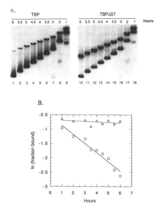 Effect of the non-conserved N-terminus on the DNA binding activity of the yeast TATA binding protein. |