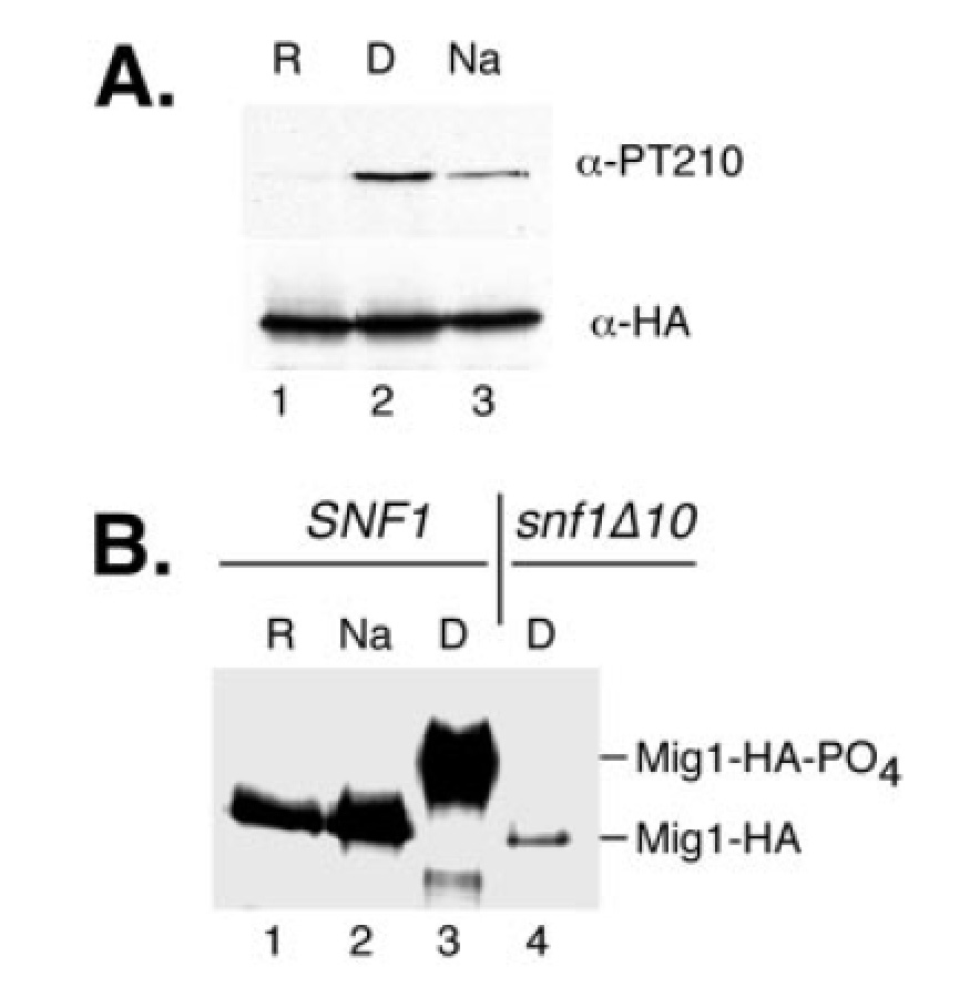 Phosphorylation of Thr210 in response to sodium ion stress. A. Western blot of Snf1 protein collected by immunoprecipitation with anti-HA antibodies from 300 ug of protein. The upper panel shows reactivity with anti-threonine 210 antibodies (-PT210), and the lower panel shows reactivity with anti-HA antibodies (-HA). Extracts were prepared from cells grown under repressing conditions (R; lane 1), derepressing conditions (D; lane 2) or in repressing conditions supplemented with 0.8 M NaCl for 1 h (Na; lane 3). B. Western blot of Mig1 protein. Extracts were prepared from cells expressing HA-tagged Mig1 protein that had been grown under repressing conditions (R; lane 1), derepressing conditions (D; lanes 3 and 4), or repressing conditions supplemented with 0.8 M NaCl for 1 h (Na; lane 2). Cells were wild type 10 (lane 4). Each lane contained 80 ug of protein. |