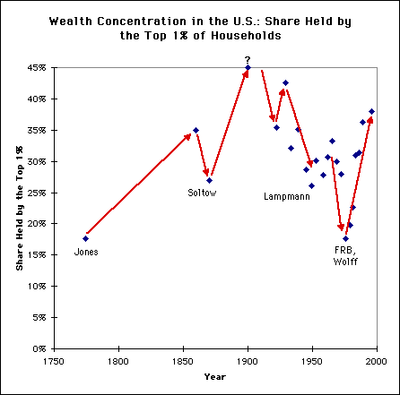 And whatever the causes, the period since the mid-1970s has seen wealth concentration in the United States increase more rapidly than ever before--even during the heyday of industrialization in the last decades of the nineteenth century. Aggregate measures of wealth concentration today are greater than at any time since the election of Franklin D. Roosevelt in the Great Depression, and are within striking distance of the peak in wealth concentration reached during the Gilded Age (see Wolff, 1994).