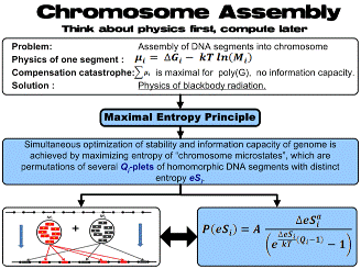 3. Applied Entromics. We have also derived the quantitative thermodynamic characterization for the assembly of many of these individual DNA segments into the chromosome. This process results in entromics' most important discovery, that a chromosome has to contain several (more than one) “daughter” segments with several diverse energies. |