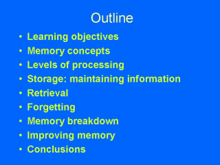 (because you cannot differentiate detail if it has no meaning). Organization is a means of giving meaning by classifying information in many different ways. The process of classification makes the classifier an encoding aid and a subsequent prompt to recall. So this lecture will use a number of cognitive strategies to aid recall. The first of these is called Explicit categorization: Say this term out loud to your self several times - think about what it means - explicit: distinctly stated, clear; categorization: the process of putting into categories. In the slide above, there are a list of categories by which this lecture has been organized: you can remember them by creating a mnemonic - a word or phrase that cues a key letter of each category, such as: Only Cats Perform Stunts Right For My Ideal Concert. This one works for me, but something else might have more meaning for you. Try to think of another one. |