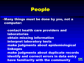 It’s also important to remember that there are many jobs that only you, not a computer, can do. For example, only you can: - contact physicians, other health care providers, and laboratories to obtain missing information, - interpret laboratory tests, - make judgments about epidemiological linkages and - duplicate records, - identify and correct mistakes in data entry, and - determine if epidemics of diseases or other adverse health events are in progress. Most importantly, only you are familiar with the people, disease patterns, reporting systems, and resources in your community that are critical to understanding and using surveillance data appropriately and communicating it to others to change policies and programs. |