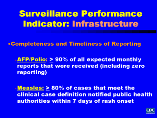 As I indicated earlier, the first type of surveillance performance indicator is one which evaluates the infrastructure of our surveillance system. A surveillance system with a well-functioning infrastructure is one in which there is good completeness and timeliness of reporting from all health care providers and organizations who encounter patients with the disease, exposure, or health behavior of interest. Surveillance reports from all reporting sites are routinely reported to the surveillance system on time. The specifics of how these requirements are met vary by disease. For example, for AFP surveillance, the surveillance infrastructure is working well if at least 90% of all clinics and other reporting sites send their reports to the central health department (where all surveillance data is gathered and summarized) at the end of each month so as it ensure its arrival within the first two weeks of the following month. For conditions such as AFP where there may not be any cases reported during a particular month, this includes sending a report to the central health department to notify them that no cases were found (i.e., zero reporting). In contrast, for a disease such as measles, where the number of cases occurring each month can still be high, a surveillance system with a well-functioning infrastructure is one in which at least 80% of cases that meet a predetermined case definition based on the occurrence of selected clinical symptoms are reported to the surveillance system within 7 days of rash onset. Similar definitions, which determine the minimum desired proportion of reporting sites that routinely provide relevant surveillance data to a central data repository in a timely fashion for analysis and summary can be developed for other types of infectious diseases, chronic health conditions, exposures, and health behaviors. |