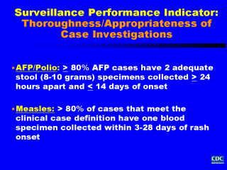 The third type of surveillance performance indicator focuses on assessing the thoroughness and appropriateness of case investigations. In the case for AFP and measles surveillance, the performance indicators define more specifically the appropriate amounts, types, and time periods in which laboratory specimens should be collected from suspected cases in order to ensure the highest likelihood that the source of infection can be thoroughly investigated and identified. |