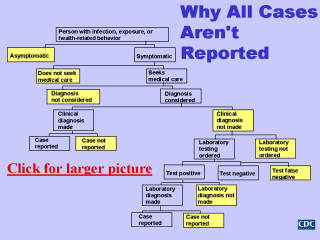 The final type of surveillance performance indicator is focused on completeness of reporting. To help us appreciate why complete case reporting is important, let’s review some of the reasons why all cases of disease, disability, or exposure that actually occur within a population or community are not reported to our surveillance system. First, the occurrence of some diseases, health conditions, or exposures are rare, and thus, within a given year none may occur within a community or population to report to a surveillance system. Even if the disease or health condition does occur within some individuals, not all of them may have clinical symptoms of disease, and thus may not seek medical attention. Among those patients who have clinical symptoms, some may still not seek medical attention, and thus, not get reported to the surveillance system. Of those who do seek medical care, their health care providers may still not recognize their disease and thus, may not consider the diagnosis. Even among cases that are clinically diagnosed, they may not be reported to the surveillance system. Among cases in which a diagnosis is considered, in the end, health care providers may still not decide upon the proper clinical diagnosis and thus, do not order appropriate laboratory tests to rule in or out the disease diagnosis. Even if laboratory tests are ordered, test results may be falsely negative, or if truly positive, the laboratory diagnosis is not made. Finally, even if the proper laboratory diagnosis is made, the case may still not be reported because the appropriate personnel are not aware of the need and/or method for reporting the case to the local surveillance system. It’s important to remember that reporting cases of disease to a surveillance system is not as important to health care providers and laboratories as it is to us; they may not appreciate the public health significance of diagnosing and reporting diseases and health conditions to public health authorities in charge of surveillance systems. Thus, delays in or failures to report cases of diseases to the surveillance system are not unexpected. |