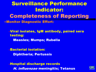 Another method to assess completeness of reporting, and the adequacy and thoroughness of case investigations, is to monitor diagnostic effort. This is done by reviewing laboratory records to determine if health care providers are obtaining appropriate laboratory specimens to confirm or rule out suspected cases of disease reported to the surveillance system. Monitoring diagnostic effort provides an answer to the question, “Is anyone suspecting the diagnoses of these diseases?” Tracking the number of specimens submitted to a laboratory even if none are positive, provides good evidence that the diagnoses are being considered, even if no cases are found. For example, tracking submission of laboratory requests for viral isolates, IgM antibody tests, and paired sera testing for measles, mumps, and rubella suggests that clinicians are looking for cases of disease and the diagnoses are being considered. Tracking laboratory requests for testing of bacterial cultures from suspected cases of diphtheria and pertussis prior to antibiotic administration serve similar purposes. Under these circumstances, the absence of reported cases is more likely to reflect the true absence of disease. Hospital discharge records can also be reviewed to identify discharge diagnoses for diseases of interest; this has been done to identify cases of meningitis due to H. influenzae, and tetanus. |