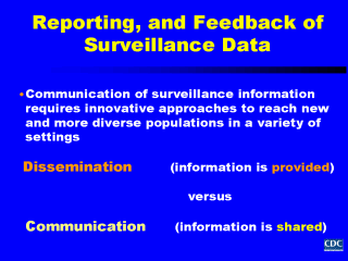 As I indicated at the beginning of my presentation, surveillance involves not only collecting and analyzing data, but also reporting it back to the people who provide it, and those who can use it to develop and change public health programs and policies. Because surveillance data provides "information for action“, we aim not just to transmit or disseminate surveillance data but instead to communicate it in a way that facilitates and encourages people to use it to improve the health of a community or population of interest. It’s important to keep in mind that: Dissemination is a one-way process in which information is conveyed from one person to another, i.e., information is provided. In contrast, communication involves both a sender and a receiver who share information in a collaborative process. We want to collaborate with our partners in health, government, and the community on efforts that will influence disease prevention and health promotion programs and policies. Let’s look at some of the types of individuals and groups we should report surveillance data to and some of the ways in which we can most effectively communicate rather than disseminate information to them. |