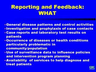 Providing regular feedback reinforces the importance of participating in pubic health surveillance. Feedback should be timely, informative, interesting, and relevant to the needs of the individual or group to which it is provided. For example, for health care providers, information about disease patterns and control activities in their area that can affect how they practice is important, while for schools and occupational settings, surveillance information on investigation and prophylaxis of contacts of cases are important to determine how best to limit the spread of disease in their institutions. In general, no matter which group you are providing feedback to, use every interaction to discuss cases and surveillance issues in general. What kinds of information is useful to provide? For clinic- and community-based health care providers, and infection control and laboratory personnel general surveillance summaries which include total case counts and characteristics of case patients are helpful as is information on the disposition of individual cases they reported to your surveillance system. In addition, laboratory reports can be matched with physician reports and for cases reported only by the laboratory, physicians notified about these missing cases which should have been reported from their practices. Another type of information that is useful is one which heightens the awareness of providers concerning the importance of looking for and reporting cases of diseases or health conditions of particular interest. For example, for infectious and vaccine-preventable diseases, special efforts could focused on health care providers who see immigrants and travelers returning from international settings to look for and diagnosis suspected cases of these diseases. In a similar fashion, physicians and nurses working in occupational settings can be encouraged to look for and report cases of exposure to toxins, and occurrences of injuries to the appropriate surveillance system. Examples of how data reported to the surveillance system was used to influence or change policies and programs can be provided to health care providers as well as schools, occupational settings, the press, and the public. Information about new medications, state-of-the-art laboratory diagnostic services, and other services available to help diagnose and treat patients and their contacts to limit the spread of disease is also useful for all the different types of audiences you feedback information to. |