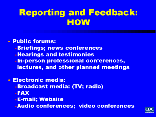 Other channels of communication include presenting information in public forums such as news conferences, hearings and testimonies, professional clinical conferences and hospital grand rounds, annual professional society meetings and conferences, and other planned meetings. More recently, electronic channels of communication have become available that allow more timely feedback of information. Besides television and radio, FAX, e-mail, websites, and audio and video conferencing present avenues through which results from surveillance data summaries and analyses can be reported, and their usefulness and impact in influencing public health policies and programs emphasized. |