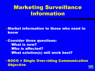 Now that we discussed who to provide information to, what information to provide, and the channels through which to provide it, let’s talk about how to market surveillance information so that it has the highest likelihood of being heeded and used. One of the most important reasons why we disseminate surveillance information is to help policy makers and intervention program planners use the information to take public health action that will prevent, minimize, and control the spread of disease. In tailoring our presentation to accomplish this, we should present surveillance information in a way so that it can be used to answer three important questions: - What information is new? - Who is affected by the disease or health issue? and, - What solutions, if any, are available, and will work best? Because we often must communicate the significance and implications of surveillance data in a concise manner, once the answers to the above questions are clear, the most important elements of each should be formulated into a simple declarative sentence and used as our single over-riding communication objective, or SOCO. Our SOCO should represent the most important public health message we would like to communicate to policy and program planners. Whenever possible, we should emphasize our SOCO during in-person contacts, oral presentations, and in print and electronic materials. |