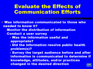 Finally, once we have provided feedback, we should evaluate the effects of our communication efforts. Was the information provided to those who needed to know? We can determine the answer to this question by monitoring the distribution of the information. For example, the effectiveness of communication provided through newspapers can be evaluated by using clipping services who determine the number of published reports, their geographic distribution, and review the content of articles to assess their accuracy. Surveys of individuals or groups targeted for the feedback information can also be conducted to determine if the information was useful and appropriate to their needs. We can also ask if the information shared had a beneficial effect on the public health problems or conditions of interest, i.e., the impact of the communication effort on changing the knowledge, attitudes, and/or practices within specific target audiences. This is accomplished by surveying our target audiences before and after surveillance information is shared to see if any changes have occurred. |