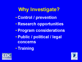 The decision to investigate is influenced by… • morbidity / mortality • unusual presentation – rare disease, change in pattern, new disease Control - prevent additional cases; prevention – prevent future outbreaks Research opportunities – identify new risk factors; define natural history and spectrum of the disease; measure impact of control measures or clinical interventions; etc. Program considerations – an outbreak may represent a failure or gap in public health program. Need to investigate to determine why. Public / political / legal concern – health department needs to be “responsibly responsive” Training – important that inexperienced epidemiologist accompanies senior epidemiologist to gain experience and feel more comfortable conducting an investigation the next time. |