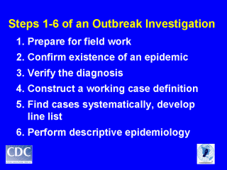 No one “right” list, but everyone needs a checklist to ensure systematic approach and to ensure that you don’t miss any key steps. This order is CONCEPTUAL. The actual order varies with the disease (for example, for hep A outbreak, implement #9 control measure [immune globlulin to exposed persons] ASAP). Also, some steps may be done at the same time, especially #2 and #3, which often come before #1. |