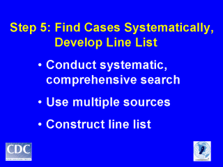 Be systematic and comprehensive in case finding. Case finding is not only to identify cases for a case-control or other analytic study, but to determine the extent of the outbreak (who is affected? are there milder cases than those that might have been the first to be reported? what is the geographic extent?) Sources might include: - asking persons with the disease (“case-patients”) if they know anyone else who has a similar illness - depending on the disease, contacting physicians, clinics, emergency departments, hospitals, university infirmaries, school nurses, and/or whichever other sites and health care providers might see persons with the illness Line list is like a spreadsheet with each row representing a case; each column is a key variable such as name or initials, date of onset of illness, diagnosis lab confirmed?, age, sex, etc. |