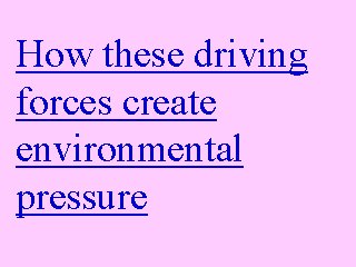 The atmosphere, fertile soils, freshwater resources, the oceans, and the ecosystems they support, play a key role in providing humans with shelter, food and safe water, and the capacity to recycle most wastes. However, the pressures exerted by the driving forces are in many instances increasing. They relate to household wastes, fresh water use, land use and agricultural development, industrialization and energy use. Some examples will be shown below. |