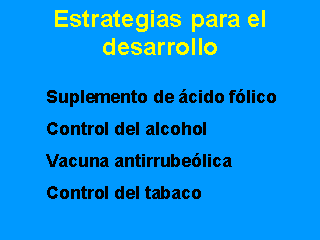 Acido fólico insuficiente, alcohol y rubéola son tres causas principales de defectos congénitos evitables (CDC-EEUU). Como en las poblaciones desarrolladas la participación de la mujer en el mercado laboral es mucho mayor que en las subdesarrolladas, los riesgos ocupacionales para el feto son más importantes entre las primeras que entre las segundas.