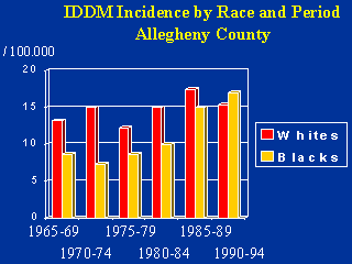 The incidence of IDDM seem to be increasing.These data is from Allegheny County, Pennsylvania and you can see a trend towards a higher incidence, especially in the Blacks to the point that in our last update of the registry we found a higher incidence in Blacks than Whites. |