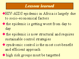 Each region presents specific caracteristics influencing the course of the epidemic. These caracteristics are important to know in order to plan adapted strategies. In Africa, the STD factor is of paramount importance and should be given the highest public health priorities. |
