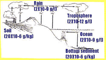 anthropogenic sources in the form of elemental vapor (Hg·). It is converted to a soluble form assumed to be Hg++. The letter is returned to the surface of the earth in rain water and may be reduced to Hg· and re-emitted to the atmosphere. Ocean sediment is believed to be the final sink where mercury is deposited in the form of HgS (WHO, 1990). |