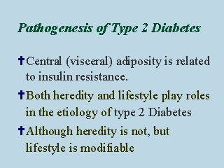 Central adiposity, especially intra-abdominal (visceral) fat, is related to insulin resistance. Heredity and lifestyle play important roles in the etiology of type 2 diabetes. Lifestyle is a modifiable factor. By modifying lifestyle, e.g. to increase physical activity and lower dietary fat intake, it may be possible to prevent type 2 diabetes. It is important to study this. |