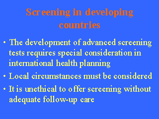 drastically across countries. Thus, quite different approaches to screening may be necessary. For example, visual inspection of the cervix, or cervicography (a photograph of the cervix) may be alternatives to the Pap smear in many countries. Similarly, clinical examination of the breast, either by a physician, or another health professional, may be an alternative to mammography. Ethical considerations are especially important when considering applying screening tests in developing countries. While some may argue that is unethical not to offer tests that are available in other countries, it is less ethical to offer tests for which adequate follow-up is not available, or to offer tests that draw resources away from activities that might better improve the health of the population, such as prenatal care or immunization programs. |