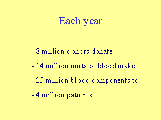 | - Less than 5% of eligible healthy Americans donate blood. The average blood donor is a college,educated white male, and is 30 - 50 years of age. - People 65 years or older represent 15% of the donor population, but use 25% of the blood components. - 88% of the nations blood is collected at blood centers; 12% at hospital-based blood drawing facilities. - Criteria for donation eligibility include being at least 17 years of age, at least 110 pounds and in good health. All donors must pass a short physical exam and health history exam prior to donation. - The U.S. blood supply is drawn from volunteer blood donors. Whole blood can be donated every eight weeks. - The approximate distribution of blood types in the U.S. is O positive, 38%; O negative, 7%; A positive, 34%; A negative, 6%; B positive, 9%; B negative, 2%; AB positive, 3%; AB negative, 1%. Type O negative red blood cells can be given to any person; a type AB positive person can receive any type red blood cells. |