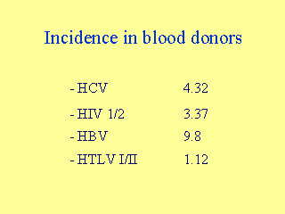 | - Incidence is per 100,000 person years: ranges: HCV 2.83 - 6.87 HIV 2.22 - 4.76 HBV 6.74 - 13.42 HTLV 0.51 - 1.98 - Incidence rates of these markers in the donor population are substantially less than the incidence rates found in the general population. This is an indication of the effectiveness of donor education and the use of the history questions in screening out high risk individuals from donation. - The intent of each new generation of tests is to improve the detection of window period donations (closing the window) and decrease the rate of false positive screening tests. |