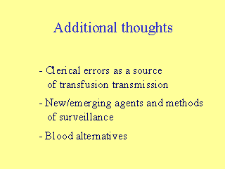 infectious disease markers); errors in testing, etc. - Surveillance for new/emerging agents is a major project for the Blood Banking industry. Because many of these agents have similar risk profiles, the donor history questions currently in use help to eliminate these donors from donating. In addition, donor/recipient serum repositories are being developed to have quick access to material to test for transfusion transmission, should a new agent be identified. - Alternatives to blood transfusion are being investigated, including artificial oxygen carriers. |