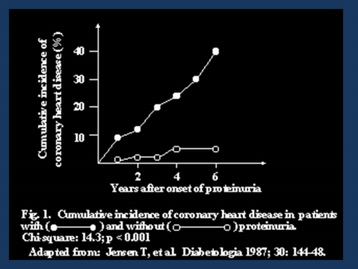 The epidemiology of heart disease in Type 1 diabetes is a little different for the relative risk is much higher and often reaches 10+ fold, reflecting the relatively low mortality from heart disease in young adults seen in the general population. As in Type 2 diabetes the gender difference in rates seen in the general population are greatly reduced. One of the strongest predictors of cardiovascular disease in Type 1 diabetes is the presence of kidney disease, particularly in men. The reasons for this may include a shared genetic predisposition to hypertension, a similarity in the pathogenetic process because athero- and glomerular sclerosis are very similar processes pathologically. Kidney disease also increases the levels of cardiovascular risk factors, blood pressure, fibrinogen and lipids for example. LDL cholesterol and triglycerides and smoking increase the risks of both CVD and kidney disease. Other risk factors include depressive symptomatology. |