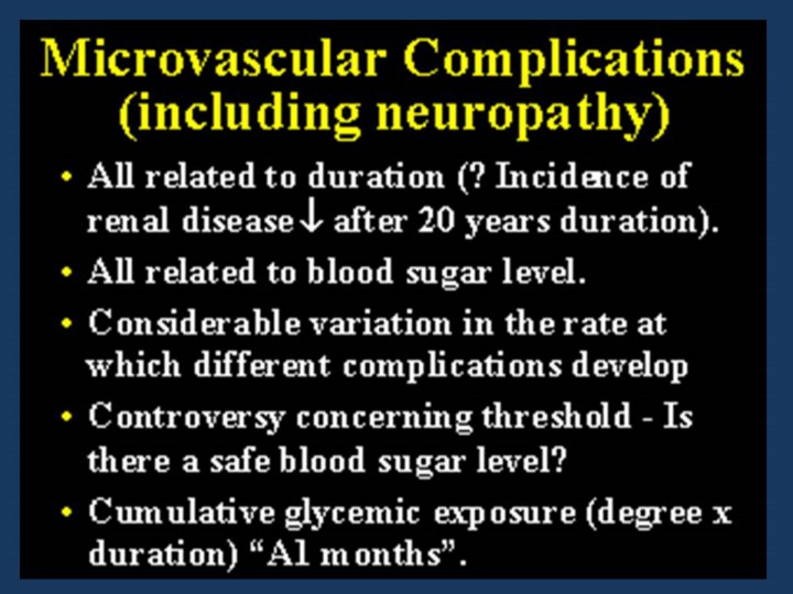 The microvascular complications, including neuropathy, are all related to both duration and blood sugar level, although past studies have suggested that the incidence of renal disease may decrease after 20 years. This has lead to the hypothesis that there is only a subgroup of Type 1 patients who are likely to develop renal disease. Even though duration and blood sugar are strong risk factors there is still considerable variation in the rate at which different complications develop and therefore other risk factors are likely to be important. In addition, there is controversy concerning whether there is a threshold, i.e. a safe blood sugar level or hemoglobin A1c (a measure of long term blood sugar exposure) below which risk is minimal or nonexistent. Investigators from the Joslin clinic have suggested such a hypothesis, but investigators from Europe and DCCT deny such a threshold. In order to examine this issue and the role of glycemic exposure more definitively, a new variable called A1months was calculated using the Pittsburgh data. |