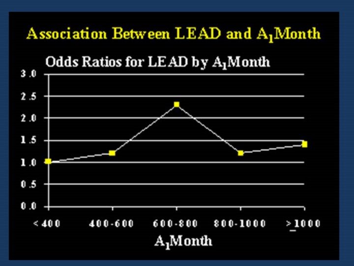 For lower extremity arterial disease an initial increase in risk by A1months is seen up until 800 A1months. However, after that the relationship appears to disappear. Further statistical analyses did suggest that hemoglobin A1 is a predictor of LEAD in Type 1 diabetes in this EDC cohort. |
