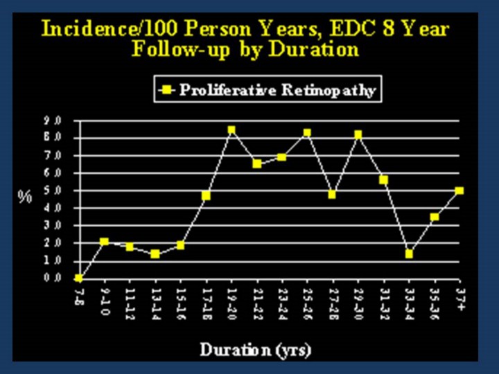 The incidence curve for proliferative retinopathy shows that there is, at longer durations, a fall off in the incidence perhaps reflecting the high cumulative incidence already achieved at that time. The small rise at 35+ years is of interest and may reflect the increased incidence of renal disease seen at these longer durations. |