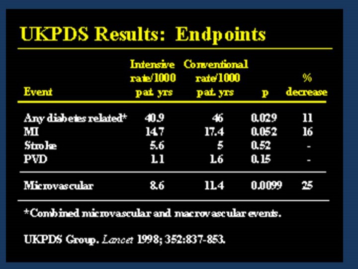 The primary endpoint of this study was any diabetes related events. For this composite endpoint there was a significant 11% reduction in favor of those treated with a more intensive regimen of initial sulphonylurea or insulin as opposed to initial diet therapy. However, the effect on myocardial infarction was only borderline and no clear effect was seen for stroke. However for microvascular complications alone a more significant 25% reduction was noted. |