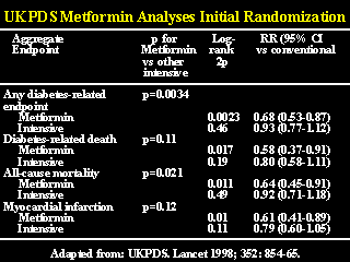 | In a separate component of the study obese subjects with diabetes were randomized to Metformin or initial diet therapy. This group had a particularly favorable outcome and a decrease was seen for myocardial infarction as well as diabetes related events and mortality |