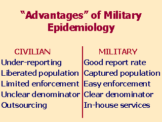 There are some distinct professional advantages to practicing epidemiology in the military. Army rules and regulations set clear guidelines for reporting of notifiable diseases, and medical staff compliance is generally very good. Thus, the data with which the epidemiologist works are often more complete than that commonly found in civilian settings. Soldiers are easily located and policy decisions fully implemented. Military populations are clearly defined and counted, and denominators (battalion population, brigade population, division population, etc.) are usually readily available for accurate computation of event rates. Finally, most goods and services necessary for public health management (epidemiologists, health educators, veterinarians, nurses, statisticians, vehicles, laboratories, printing presses, office supplies, etc.) are available in-house at reduced cost. |