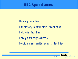 NBC agents can be obtained from many possible sources including home “breweries”, theft from laboratories or commercial sources, or stolen from industrial sites. Rogue nations may supply agents as state sponsored acts. Research facilities have always provided a possible source of agents.