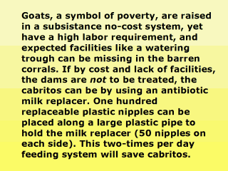 | The level of penicillin G is about 12 m g per 6 % of body weight at each feeding, but needs extensive testing. In Mexico, the cabritos are left alone in the corrals all day while their mothers are browsing in the spiney matorral (short open leguminous woods). Regardless, this promising replacer system is insufficiently tried out. |