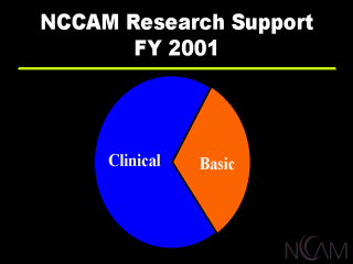 | The end of our strategic consideration is that we invest today more in clinical research than in basic research. About 5/8 of our dollars are spent on clinical research, because the public deserves answers sooner while we’re finding out additional information why some of these practices work, how they work, and what interactions they may have. This is sort of the exact mirror opposite from most of the other NIH institutes, which invests primarily in basic discovery. |