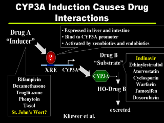 its excretion. Birth control pills and cyclosporin, the drug important for preserving transplants, as well as indinavir are targets of CYP3A, and CYP3A activity will speed the metabolism of those drugs. Now, the question is what regulates the expression of CYP3A? It comes from a gene that’s regulated by an upstream promoter, and various drugs can induce binding of nuclear receptors to that promoter, increasing expression of CYP3A, increasing the accelerated metabolism of these drugs. The kinds of drugs that we know can up regulate the expression of CYP3A include rifampicin, the tuberculosis drug; steroids, diabetes drug, the anti-epilepsy drug Phenytoin, the cancer drug, Taxol, and possibly -- and this was the purpose of this work –- St. John’s wort as well. |