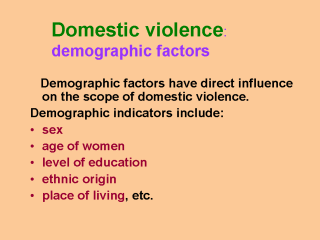 committed by husband Ethnic origin: Violence committed against women in the family is more common to Kazakh and other Asian families (Uzbek, Tatar, Uigur, etc.) as compared to European ethic groups (Russians, Ukrainians, Germans, etc.) Level of education: the higher a woman’s level of education, the less likely she will be exposed to violence. This feature is exemplified by the indicator of secondary education. Over half of the women surveyed with incomplete secondary education report having suffered from domestic violence. At the same time the number of women with incomplete secondary education does not exceed 30%. Social and professional status: the higher a woman’s social and professional status, the smaller the risk of her being exposed to domestic violence. There is one exception – businesswomen – whose status is normally considered to be high. However, she is comparatively often exposed to violence. This is a glaring contradiction. However, businesswomen are often small traders/market women who are economically forced to undertake such activity due to small incomes. Area of living: Violence against women is wider spread in rural areas than in urban areas. Regional aspect: The prevalence of domestic violence can be ordered by region in decreasing prevalence as follows: Southern, Almaty, Western, Northern, Central, Eastern. See the table: Influence of demographic factors on domestic violence |