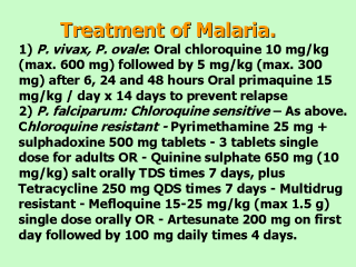 Supportive Therapy : IV fluids, blood transfusion, etc. Chemoprophylaxis: Usually chloroquine 300 mg base once weekly,