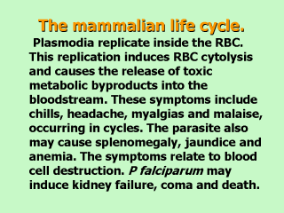 | P. vivax and P ovale may produce a dormant form that persists hidden in the liver of infected individuals and emerges later. Therefore, infection by these species requires treatment to kill any dormant protozoan as well as the actively infecting organisms. This cycle is exoerythrocytic (outside the RBCs). |
