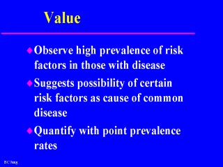 | Cross-Sectional studies are useful in looking at health problems and issues that affect a large portion of the population, and at the same time help to identify those factors that contribute to the problem or issue. Once the factors are identified, then these factors can be targeted for interventions. |