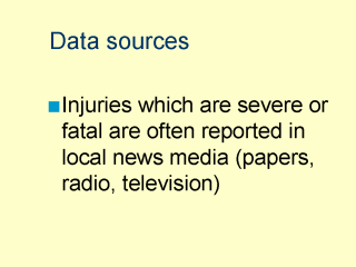 If a local newspaper is available, these often provide significant details about injuries which may have occurred in the area. Other news media may be radio or television reports of local events, including severe and fatal injuries. |