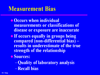 completely accurate. Think of blood pressure machines and “white coat hypertension.” Random errors (less serious) can occur when exposed and controlled specimens are analyzed randomly by different laboratories. Systematic errors occur when all specimens from the exposed group is analyzed in one lab and specimens from the controlled group are analyzed in another lab. If the labs produce systematically different results when analyzing the same specimen, then the study has become biased. Recall bias – differential recall of information by cases and controls. |
