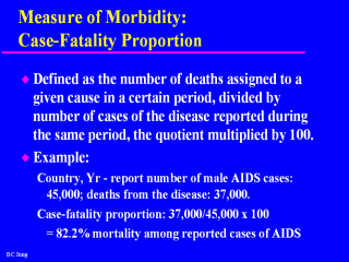 | Case-fatality proportion uses the relative number of deaths as an indicator of the disease severity. It is used as a means of showing the relative effectiveness of various methods of treatment. |